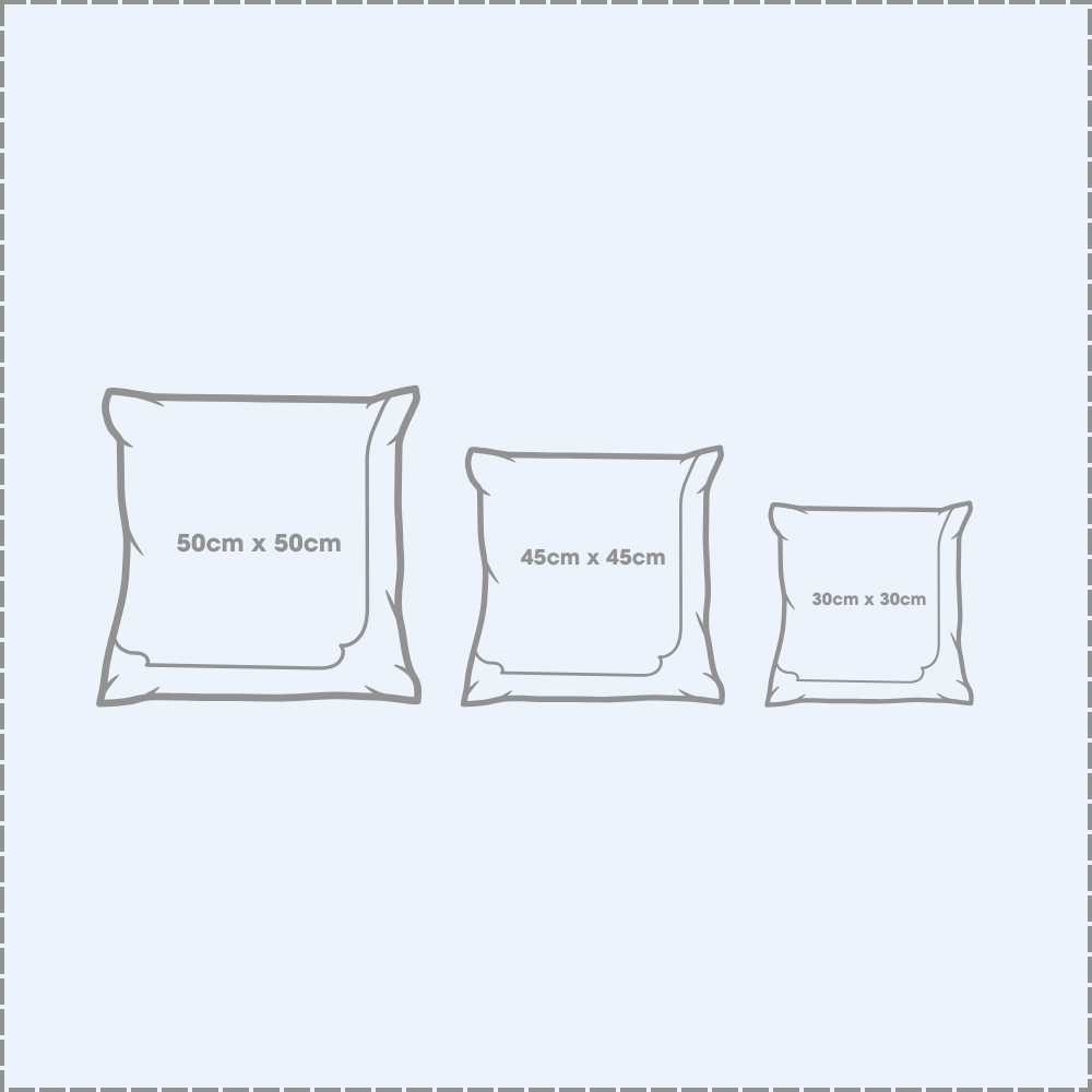 Cushions come in 3 popular sizes: 30cm x 30cm, 45cm x 45cm and 50cm x 50cm. We can also produce custom sizes. Contact Us