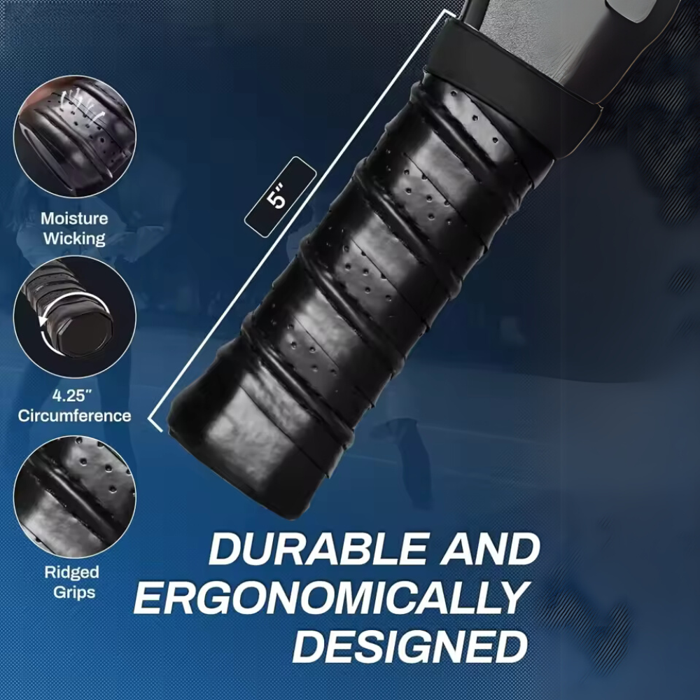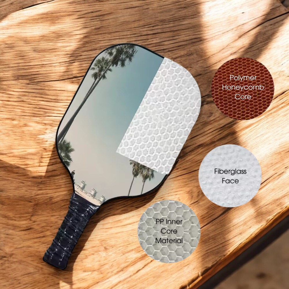 Introducing our high-performance pickleball paddle, designed for power, control, and precision. Ideal for players of all levels, it features a hand-wrapped ergonomic grip for comfort and a lightweight fibreglass surface paired with a polypropylene honeycomb core for superior feel and power. The smooth hitting surface and conventional shape provide a larger sweet spot, ensuring more solid contact with the ball.